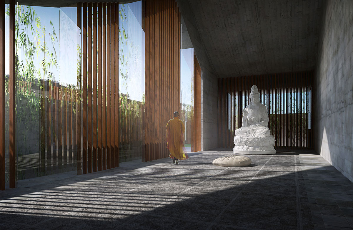 The project was located in the heart of Tangzhen county, Pudong district of Shanghai. With careful arrangement of the architectural openings and closings, and strict control of the courtyard dimensions, our design successfully preserved the spirit of the temple: tranquility, peace, retreat and isolation, expressed the spatial appeal of the Buddhism religion surrounded by the hustle and bustle of a modern city. Temples should become the cultural place of a city and fully execute their communal purpose. We designed the temple together with an urban green park that opens to the public all day, the temple was part of it, collectively they were named the“All Living Beings Zen Garden”.Temples should also absorb the characteristics of the contemporary world. Through the use of clear water concrete, bamboo steel, titanium zinc plate and some other modern materials, we transformed the language of the modern world into a building and space of traditional charm, emotion, and memory. As a unique modern temple building in China, this project has attracted a lot of attention during the construction, and now the temple is becoming a cultural name card of Tangzhen county of Pudong.