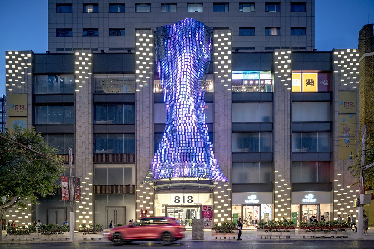 项目为一个旧商业的改造,位于中国最知名的商业街“上海南京西路”。设计把商业展示、灯光亮化统一考虑,用“轻”的手法塑造一个具有艺术性、标识性、感官性的艺术商业场所。区别于传统商业广告系统,如银河洒落凡尘的LED灯幕,可进行多元的商业投射活动,形成独具艺术与标识的入口形象;立面石材与透光彩绘玻璃继续延伸到广场铺装,创造律动、可感的灯光系统。