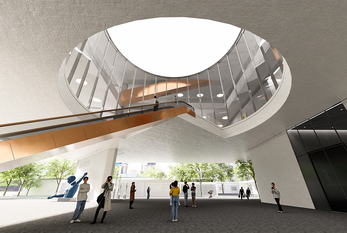 我们希望本项目的设计成为公共建筑与城市环境共享互动的典范。项目基地被高密度且封闭的城中村环抱,现状几乎是一片城市死角。我们打开场地与城中村的边界,拉通与城中村联系的路径,把场地塑造为一个四通八达的口袋公园。新建建筑底部全部架空,放射形十字剪力墙结构让各个方向最大程度的开放。场地成为了片区步行路径的交汇之地,也成为周边居民的户外活动空间,市井生活与文化建筑一同创造场地的活力。建筑被集约设置为一个立方体,一条立体的慢行路径串联起建筑内各个楼层,沿路径的一系列独特空间在立面上露出一个个局部,形成丰富的立面表情,一座未来感的建筑从烟火气的城中村里生长出来。
